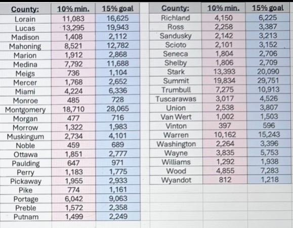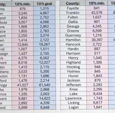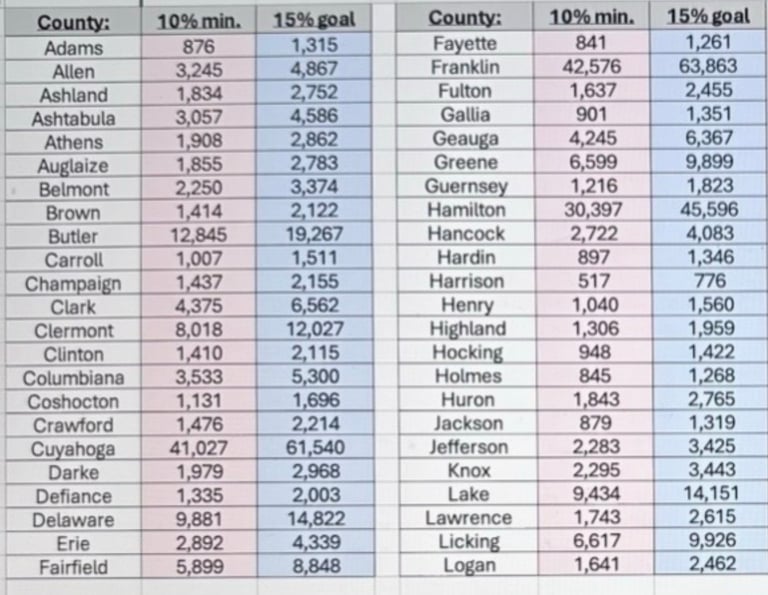 PINK Column (10%): This column shows the MINIMUM number of signatures required to submit the petition to the Secretary of State's office. In reality, we will need significantly more than this number because many signatures will be disqualified.